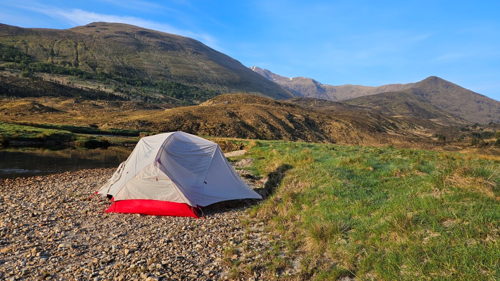 Yet, scenery made up for it- Glen Affric is simply stunning. Remote, surrounded by the mountains- everything I could ask for from a walk. I bumped into someone walking the way and been told about the wonderful camping spot just by the Loch Affric- I knew that’s where I wanted to spend my night. There is a bothy on the way, Camban Bothy, but it was closed as the work party was going on. I stopped for a quick chat and got told next time I will be there, there will be a toilet outside. Woohoo!